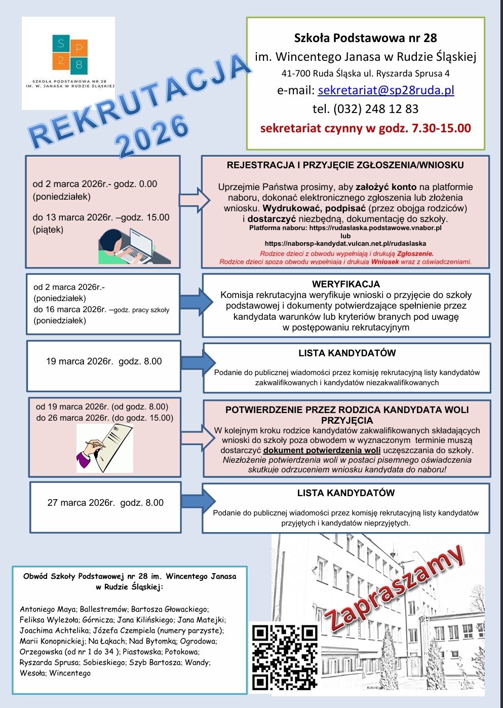 Prosimy o zapoznanie się z Zarządzeniem Prezydenta Miasta Ruda Śląska - images/pdf/zarzadzenieprezydenta2026.PDF w sprawie ustalenia harmonogramu czynności w postepowaniu rekrutacyjnym i postępowaniu uzupełniającym na rok szkolny 2026/2027 do publicznych szkół podstawowych, dla których Miasto Ruda Śląska jest organem prowadzącym oraz